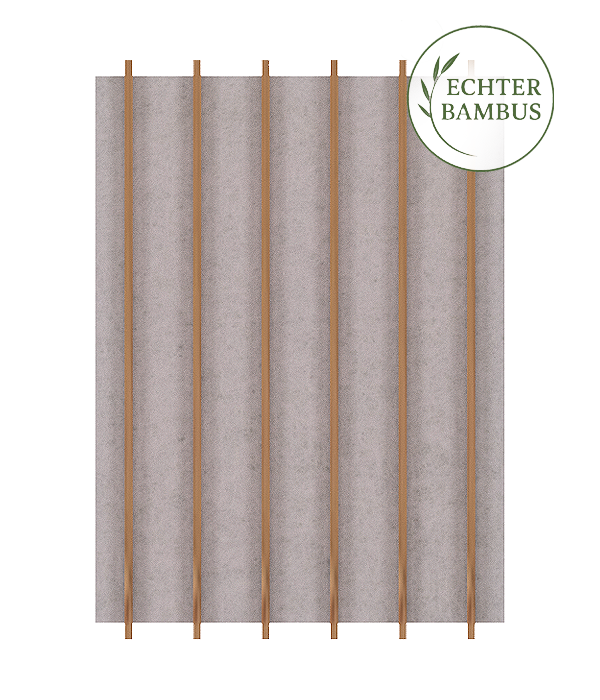 Das Lamellenpaneel ist mit 3 mm dünnen Bambusleisten und 18 mm dickem weißem Filz gefertigt. Diese Farbkombination schafft ein Stück Einzigartiges in jedes Wohnambiente.